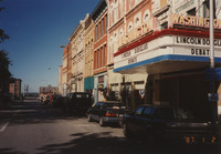 A view of an open street and cars parked on the side near the Washington Theater, whose marquee says "Lincoln-Douglas Debate." This photograph was taken as part of filming C-SPAN's Lincoln-Douglas Debates series in Quincy, Illinois.