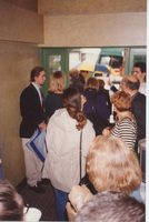 A group of people speak while a crowd of other people wait in a hallway to exit through an exterior door at the Carl Sandburg State Historic Site. This photograph was taken as part of filming C-SPAN's Lincoln-Douglas Debates series in Galesburg, Illinois.