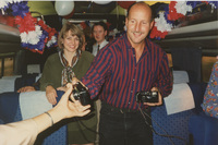 Someone out of frame exchanges a camera with a person holding another camera, while Susan Swain and another person look on from behind them. All stand in a bus decorated with red, white, and blue paper decorations. This photograph was taken as part of filming C-SPAN's Lincoln-Douglas Debates series in Galesburg, Illinois.