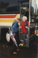 A person holding an umbrella lends a hand to an elderly person exiting a bus. This photograph was taken as part of filming C-SPAN's Lincoln-Douglas Debates series in Galesburg, Illinois.