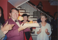 A person holds a cake while other people clap and someone captures a picture from a staircase nearby. This photograph was taken as part of filming C-SPAN's Lincoln-Douglas Debates series in Quincy, Illinois.
