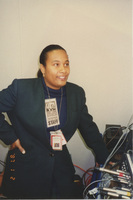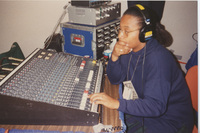 Sherry Sanders-Smith, wearing a headset and a Lincoln-Douglas Debate Staff badge, sits at a large mixing board. This photograph was taken as part of filming C-SPAN's Lincoln-Douglas Debates series in Quincy, Illinois.