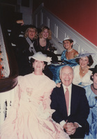 Brian Lamb poses seated on a staircase with several people dressed in 19th-century period dresses and hats. This photograph was taken as part of filming C-SPAN's Lincoln-Douglas Debates series in Quincy, Illinois.