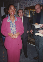 A young person wearing a magenta sweater and skirt, holding a glass, stands in a parlor area with a group of people who are holding plates of food. This photograph was taken as part of filming C-SPAN's Lincoln-Douglas Debates series in Quincy, Illinois.