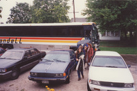 Several people collect their luggage while standing outside around a bus. This photograph was taken as part of filming C-SPAN's Lincoln-Douglas Debates series in Galesburg, Illinois.