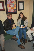 Two people sit on benches with paper plates of food on their laps. This photograph was taken as part of filming C-SPAN's Lincoln-Douglas Debates series in Galesburg, Illinois.