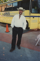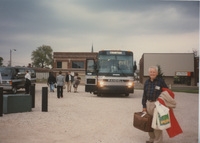 A person holding some luggage and coats stands outside a Randell charter bus parked in a gravel lot. This photograph was taken as part of filming C-SPAN's Lincoln-Douglas Debates series in Galesburg, Illinois.