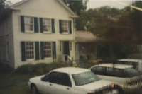 A blurry image of a white house with green shutters and two white cars parked out front. This photograph was taken as part of filming C-SPAN's Lincoln-Douglas Debates series in Galesburg, Illinois.