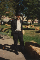 A person dressed in 19th-century period costume, possibly to look like Abraham Lincoln, poses near some hay bales on a town square. This photograph was taken as part of filming C-SPAN's Lincoln-Douglas Debates series in Quincy, Illinois.