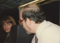 Susan Swain speaks to a person wearing glasses who is turned from the camera. This photograph was taken as part of filming C-SPAN's Lincoln-Douglas Debates series in Galesburg, Illinois.