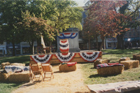 A young person wearing a magenta sweater and skirt and wearing a Lincoln-Douglas Debates Staff badge stands near an outdoor stage adorned in red, white, and blue banners and several hay bales covered in cloth. This photograph was taken as part of filming C-SPAN's Lincoln-Douglas Debates series in Quincy, Illinois.