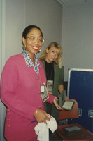 Sherry Sanders-Smith, wearing a Lincoln-Douglas Debates staff badge, leans on a table near some production equipment. This photograph was taken as part of filming C-SPAN's Lincoln-Douglas Debates series in Quincy, Illinois.