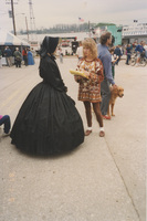 A young person speaks to a person in a long, black, 19th-century period dress near an outdoor fair. This photograph was taken as part of filming C-SPAN's Lincoln-Douglas Debates series in Galesburg, Illinois.