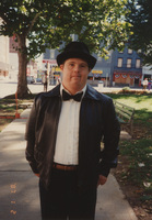 A person wearing a suit, bowtie, and bowler hat poses outdoors. This photograph was taken as part of filming C-SPAN's Lincoln-Douglas Debates series in Quincy, Illinois.