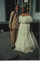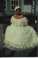 A person wearing a white, lace, period dress poses outdoors with Sherry Sanders-Smith, who has on a Lincoln-Douglas Debate Staff badge. This photograph was taken as part of filming C-SPAN's Lincoln-Douglas Debates series in Quincy, Illinois.
