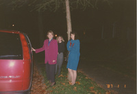 Susan Swain and two other people stand outside near a red van. This photograph was taken as part of filming C-SPAN's Lincoln-Douglas Debates series in Quincy, Illinois.