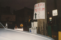 A man stands by a telephone pole with a sign which says "History Museum, 3 blocks" with an arrow. This photograph was taken as part of filming C-SPAN's Lincoln-Douglas Debates series in Alton, Illinois.