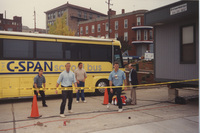 Several individuals stand near the C-SPAN Bus in an area marked off with traffic cones and caution tape. This photograph was taken as part of filming C-SPAN's Lincoln-Douglas Debates series in Alton, Illinois.