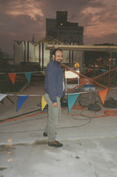 A person stands outdoors near some bunting and some production equipment and cords. This photograph was taken as part of filming C-SPAN's Lincoln-Douglas Debates series in Alton, Illinois.