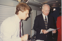 Brian Lamb reads some papers while another person sits beside him looking at other papers. This photograph was taken as part of filming C-SPAN's Lincoln-Douglas Debates series in Alton, Illinois.