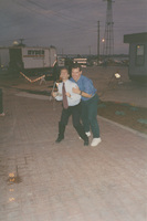 A person stands outdoors on a brick street holding his Lincoln-Douglas Debate Staff badge while another person grabs him from behind and they pose for the camera. This photograph was taken as part of filming C-SPAN's Lincoln-Douglas Debates series in Alton, Illinois.