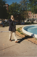 A person talking into a portable two-way radio walks outdoors near a fountain. This photograph was taken as part of filming C-SPAN's Lincoln-Douglas Debates series in Quincy, Illinois.