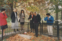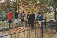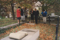 A group of people stand around a gravesite enclosed in an iron fenced area of a cemetery. This photograph was taken as part of filming C-SPAN's Lincoln-Douglas Debates series in Alton, Illinois.
