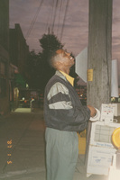 A person holding tape stands near a telephone pole and gazes up at the sky. This photograph was taken as part of filming C-SPAN's Lincoln-Douglas Debates series in Alton, Illinois.