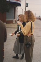 Two people stand near a street corner, speaking with others who are out of frame. This photograph was taken as part of filming C-SPAN's Lincoln-Douglas Debates series in Alton, Illinois.