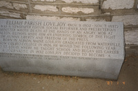 View of a memorial stone which reads "Elijah Parish Lovejoy (Nov. 9, 1802-Nov. 7, 1837) was a newspaper editor, social reformer, and Presbyterian minister whose death at the hands of an angry mob at Alton, Illinois, made him an enduring symbol of the fight for human liberty and freedom of the press. Born in Albion, Maine, Lovejoy graduated from Waterville (Now Colby) College in 1826. Lovejoy decided to become a minister and returned to the east to study at Princeton Theological Seminary." This photograph was taken as part of filming C-SPAN's Lincoln-Douglas Debates series in Alton, Illinois.