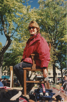 A person poses amid an outdoor street market on a brick street. This photograph was taken as part of filming C-SPAN's Lincoln-Douglas Debates series in Alton, Illinois.