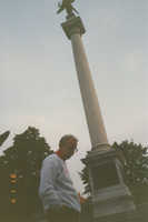 A person poses near a tall, outdoor column topped with a winged figure. This photograph was taken as part of filming C-SPAN's Lincoln-Douglas Debates series in Alton, Illinois.