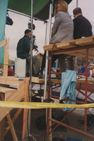Individuals sit on a tall outdoor platform with production lights; one person takes a picture of the photographer. This photograph was taken as part of filming C-SPAN's Lincoln-Douglas Debates series in Alton, Illinois.