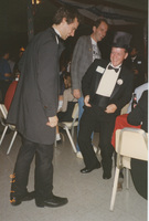 Two people dressed in 19th-century period costume laugh together in a room with people seated at several temporary dining tables. This photograph was taken as part of filming C-SPAN's Lincoln-Douglas Debates series in Alton, Illinois.