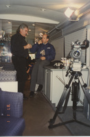 Two people sit in a room with production equipment, possibly on the C-SPAN Bus. This photograph was taken as part of filming C-SPAN's Lincoln-Douglas Debates series in Alton, Illinois.