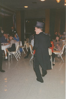 A person dressed in 19th-century period costume dances in the middle of a dining room as people seated at tables watch. This photograph was taken as part of filming C-SPAN's Lincoln-Douglas Debates series in Alton, Illinois.