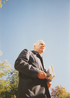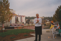 A view of Brian Lamb standing outdoors, taken from a low angle. This photograph was taken as part of filming C-SPAN's Lincoln-Douglas Debates series in Alton, Illinois.