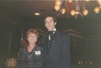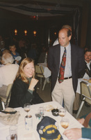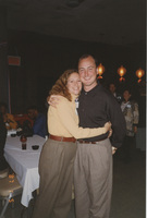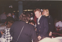 Two people pose with their arms around each other in a restaurant dining room. This photograph was taken as part of filming C-SPAN's Lincoln-Douglas Debates series in Alton, Illinois.