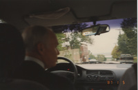 A blurred close-up of Brian Lamb driving a car. This photograph was taken as part of filming C-SPAN's Lincoln-Douglas Debates series in Alton, Illinois.