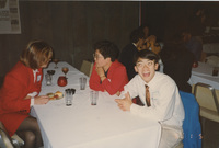 A person seated at a dining table smiles at the camera while another person stands near her. This photograph was taken as part of filming C-SPAN's Lincoln-Douglas Debates series in Alton, Illinois.