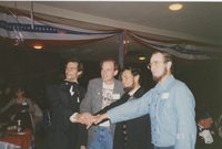 Four people hold beverages and refreshments while standing in a darkened room. This photograph was taken as part of filming C-SPAN's Lincoln-Douglas Debates series in Alton, Illinois.