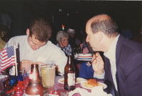 Two people sit at a restaurant table decorated with small American flags and eat and drink refreshments. This photograph was taken as part of filming C-SPAN's Lincoln-Douglas Debates series in Alton, Illinois.
