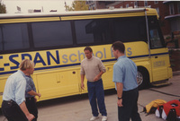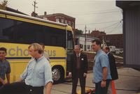 A group of people stand on the sidewalk outside the C-SPAN Bus. This photograph was taken as part of filming C-SPAN's Lincoln-Douglas Debates series in Alton, Illinois.