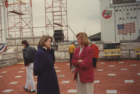 Susan Swain speaks with Donald Hirsch whose back is to the camera while they stand in a large outdoor courtyard near some storefronts. Crowds mill about around them. This photograph was taken as part of filming C-SPAN's Lincoln-Douglas Debates series in Alton, Illinois.