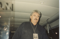 A person wearing a Lincoln-Douglas Debate Staff badge and a headset sits in a room with a lot of production equipment. This photograph was taken as part of filming C-SPAN's Lincoln-Douglas Debates series in Alton, Illinois.