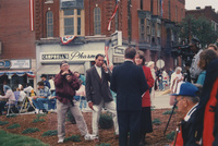 A large group of people and people stand in an outdoor street market. This photograph was taken as part of filming C-SPAN's Lincoln-Douglas Debates series in Alton, Illinois.