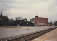 An empty road with a train and another set of train tracks nearby; an advertisement for the Lincoln-Douglas Debates is visible on the side of a building. This photograph was taken as part of filming C-SPAN's Lincoln-Douglas Debates series in Alton, Illinois.