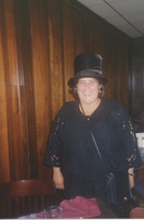A person wearing a costume top hat laughs at the camera. This photograph was taken as part of filming C-SPAN's Lincoln-Douglas Debates series in Alton, Illinois.