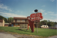 The signpost for the Lincoln Motel, which advertises that it is air conditioned, American owned, and with clean, modern rooms. This photograph was taken as part of filming C-SPAN's Lincoln-Douglas Debates series in Alton, Illinois.