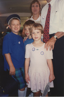 Brian Lamb stands on a porch posing with two people. This photograph was taken as part of filming C-SPAN's Lincoln-Douglas Debates series in Alton, Illinois.